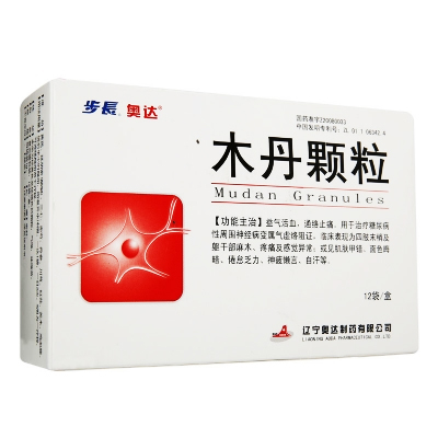 木丹颗粒的医药成分是黄芪、醋制延胡索、三七、赤芍、丹参、川芎、红花、苏木、鸡血藤等组成,味微苦。临床上可以益气活血,通络止痛。木丹颗粒常用于治疗糖尿病性周围神经病变属气虚络阻证,临床表现为四肢末梢及躯干部麻木、疼痛及感觉异常;或见肌肤甲错、面色晦暗、倦怠乏力、神疲懒言、自汗等。由于木丹颗粒是多味中药组成,所以一般副作用较小,所以能放心使用。